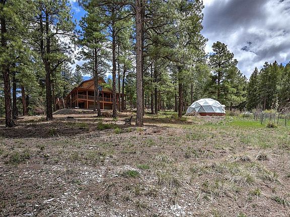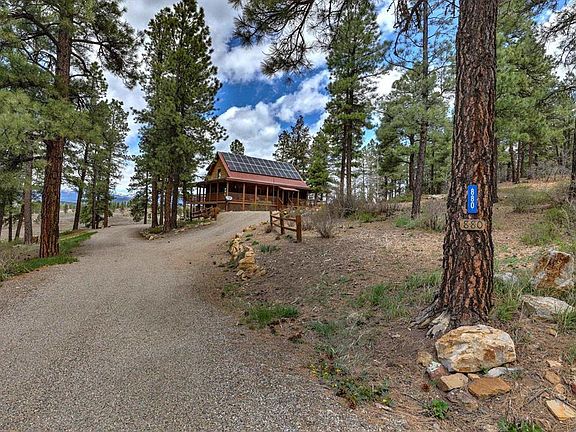 Presenting 880 Easy Street. This stunning 2371 Square Foot Log home on 3 acres in Pagosa Springs, Colorado is nestled among the picturesque pines, offering unobstructed panoramic mountain views that will capture your heart as soon you arrive. The custom built home features 360 wrap-around decks, providing a truly immersive experience in nature. Among its many features are a rooftop solar system for energy efficiency with an inverter for plug-in EV, a secluded location at the end of a private cul-de-sac ensuring complete privacy. The primary bedroom is on the first floor, and two guest rooms are on the upper level. The property also includes a 22' grow dome, cellular shades on all windows and sliding doors, and the property borders the 1300+ acre Valley View Ranch. Additionally, you'll find an oversized garage, with a work area, on demand water and ETS heating system, a free standing Vermont Castings propane stove in the living room, and a wide variety of perennial plants, and an apple and pear orchard, also, raspberries, asparagus, rhubarb, just to mention a few. A retractable shade sail on the back deck, wildfire mitigation has been completed. Renewal by Anderson windows and doors add to the comfort and safety of this home. Completing the picture is a designated spot for RV parking, making this property a perfect blend of natural beauty, modern amenities, and thoughtful design, perfect for those looking to immerse themselves in the tranquil beauty of Pagosa Springs.