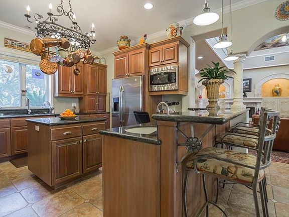 Nestled in a small (9 lot) deed-restricted, gated suburban community, this elegant, custom home offers ambiance, comfort and style for the ultimate Florida living experience. With upgrades and unique decorator features too numerous to list, this spectacular home provides the perfect environment for gracious entertaining as well as relaxation. You enter through massive double doors to a spacious foyer, large formal sitting room and dining room. The great room is the center of the home and offers decorative built-in cabinetry with wood burning fireplace and guest half bath. A disappearing glass wall opens to give you almost unlimited access to lanai and pool. The gourmet kitchen includes a gas 6 burner cooktop, stainless steel appliances including gas/convection double ovens and microwave, granite counter tops, island for easy prep, breakfast bar and a walk-in pantry. The breakfast nook features a panoramic view of the pool and yard with disappearing sliding doors. Wet bar with wine captain opens between the dining room, kitchen and great room making entertaining easy and fun. The split floor plan ensures privacy for both family and guests. The light and bright owner's suite encompasses over 600 sq ft and offers gas fireplace and a luxurious master bath with 9 x 13 walk-in custom designed closet, double sinks, separate tub, large shower and bidet. The 2nd downstairs guest suite is off large game room and boasts a private entrance plus full bath with tub and shower. See additional remarks