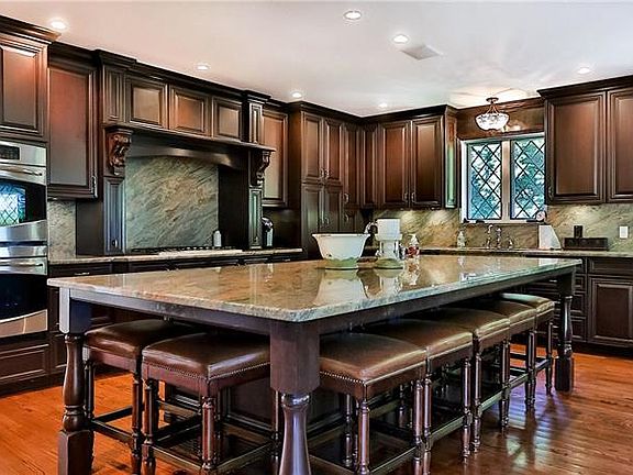 On a premier street in Virginia Manor this stunning stone home features rich details of the Tudor style; stained /leaded glass windows, arched doorways, raised paneled doors, slate roof. As you enter the foyer you are greeted by an interior wall of stained glass. To your left is oversized sunken dining rm with marble fireplace. Step into the huge addition with gourmet kitchen, high-end appl, large granite island open to the family rm with wall of windows, built-ins, fireplace. The living rm with wrap-around wall of built-ins. Home office, study and updated powder rm finish the 1st floor. Follow the staircase with iron railings & stained glass to the 2nd floor w/ 5 bedrms, 3 full baths. The master bedrm ensuite is a retreat with beautiful renovated bath, 2 vanities, free standing tub, large shower. The lower level has a gameroom w/builtins, large exercise rm, private office. Glass doors to the deck overlook a terraced yard with custom seating area. Dual 2 car garages/ plenty of storage