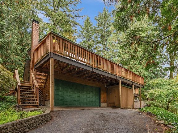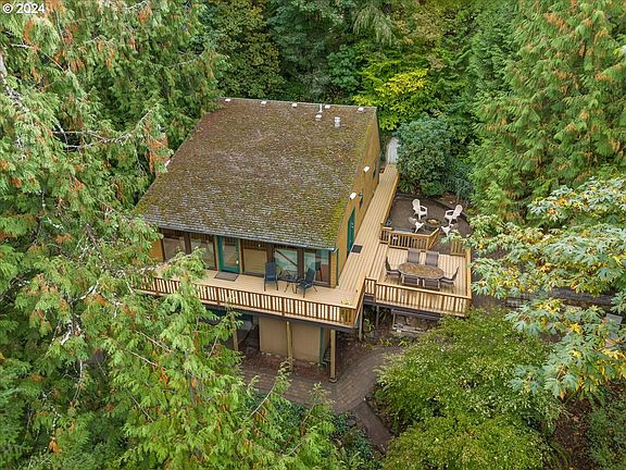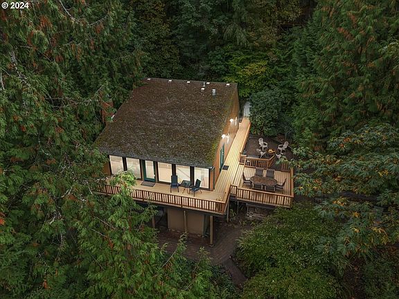 Nestled on a serene 1/3 acre wooded lot in the highly sought-after and extremely quiet Sylvan Highlands neighborhood, this 2,000 sq. ft. home offers a perfect blend of nature and modern comfort. In the upper level, oak hardwood floors, floor-to-ceiling windows with motorized blinds, a wood-burning stone fireplace and a vaulted, beamed ceiling create a bright and open space with stunning views of the surrounding trees. The gourmet kitchen is a chef’s delight, featuring granite and slate finishes, custom cherry cabinets, undercounter and cove base lights, and modern stainless appliances. Also upstairs, you’ll find two bedrooms, including a spacious primary suite that boasts its own wall of windows and French doors, flooding the room with natural light. The luxurious primary bath is a spa-like retreat with cherry cabinets, a jetted tub, stall shower, dual vanity, and a private sauna for ultimate relaxation. The lower level offers a versatile space perfect for work and play, including an office alcove and a massive media room with brand-new carpet, a built-in granite bar, surround sound, and a ceiling-mounted projector—ideal for movie nights or game days. All electronics are included for a seamless entertainment experience. There’s also a spacious laundry room with front-loading washer and dryer and ample storage.Designed for indoor-outdoor living, the wrap-around deck leads to a lower deck with a dining area, fire pit, and peaceful waterfall. Enjoy the multiple pathways meandering through the beautiful grounds with landscape lighting. Conveniently located in the Bridlemile school district, with easy access to downtown Portland, freeways, and Beaverton shopping, this home truly has it all. Don’t miss out on this rare opportunity! [Home Energy Score = 8. HES Report at https://rpt.greenbuildingregistry.com/hes/OR10233786]