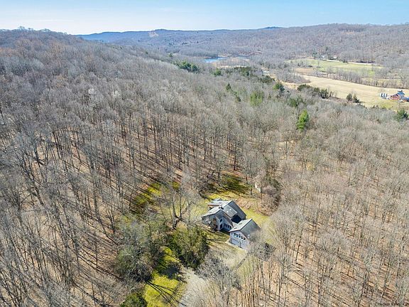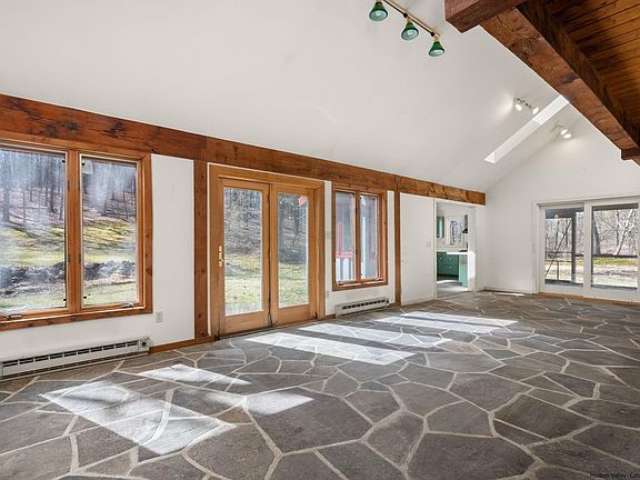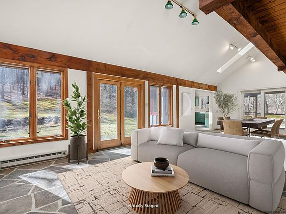This private contemporary home, nestled upon a hilltop with 14 plus acres is an idyllic country retreat. Enter light filled spacious rooms, with vaulted and beamed ceilings to begin your next journey of Zen living. One can feel the experience of being as one with nature, as the vast array of windows welcomes the outdoors in. The home’s pallet is clean and awaits your vision to take this diamond in the rough to the next level. The first floor offers a family room, dining room with brick fireplace, open floor plan living, screened porch and first floor primary. Ascend to the second floor where 2 bedrooms, a den and an outdoor terrace complete the home. There is a two-car garage, with finished studio space above, perfect for a home office or luxurious guest suite. The grounds offer a patio for outdoor dining, a level back yard and ample space to add a pool should one wish. Only a short drive to the villages of Rhinebeck or Red Hook, this home is a rare find indeed.