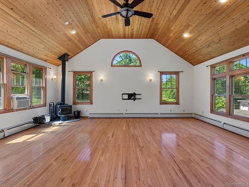 - Features: Cathedral Ceiling(s), Bookcases, Ceiling Fan(s), Wood Stove, Sliders, Hardwood Floor
