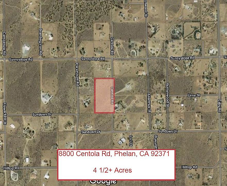 +/- 4.52 acres South of Phelan Road. Existing homes nearby. Mountains to the south make this a great place to build. Lot maybe able to be split, contact county to verify. Power pole onsite. Buyer to verify all utilities. Please do not contact me to offer realtor/broker or other services. Offering 1% for buyer’s realtor/broker.