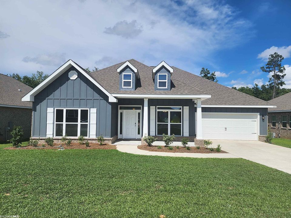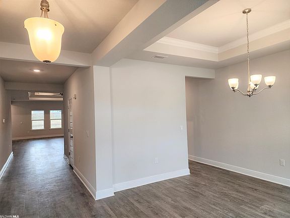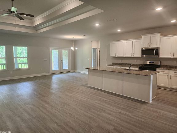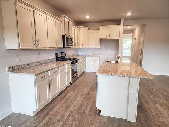 Primland is conveniently located approximately 1.5 miles East of Foley Beach Express at the corner of County Rd 12 and Wolf Bay Drive. Primland is within minutes of the beautiful beaches, water, shopping, and all that Foley and South Baldwin County has to offer. The 5-bedroom McKenzie floorplan has a spacious open concept plan and is loaded with designer details! White designer painted cabinets with soft close doors, stainless hardware, granite countertops and vanities, stainless appliances including gas range, beautiful easy to maintain luxury vinyl plank flooring throughout. Primary suite features 10 foot trey ceiling, dual sink vanity, HUGE 7'8"x11'4" walk-in closet, garden tub and separate 5 foot shower. Back porch overlooks huge back yard which is adjacent to wooded common area. Home is located just steps from the pool and tennis courts. *This home is being built to Gold Fortified Home TM certification, which may save buyer on homeowners insurance.