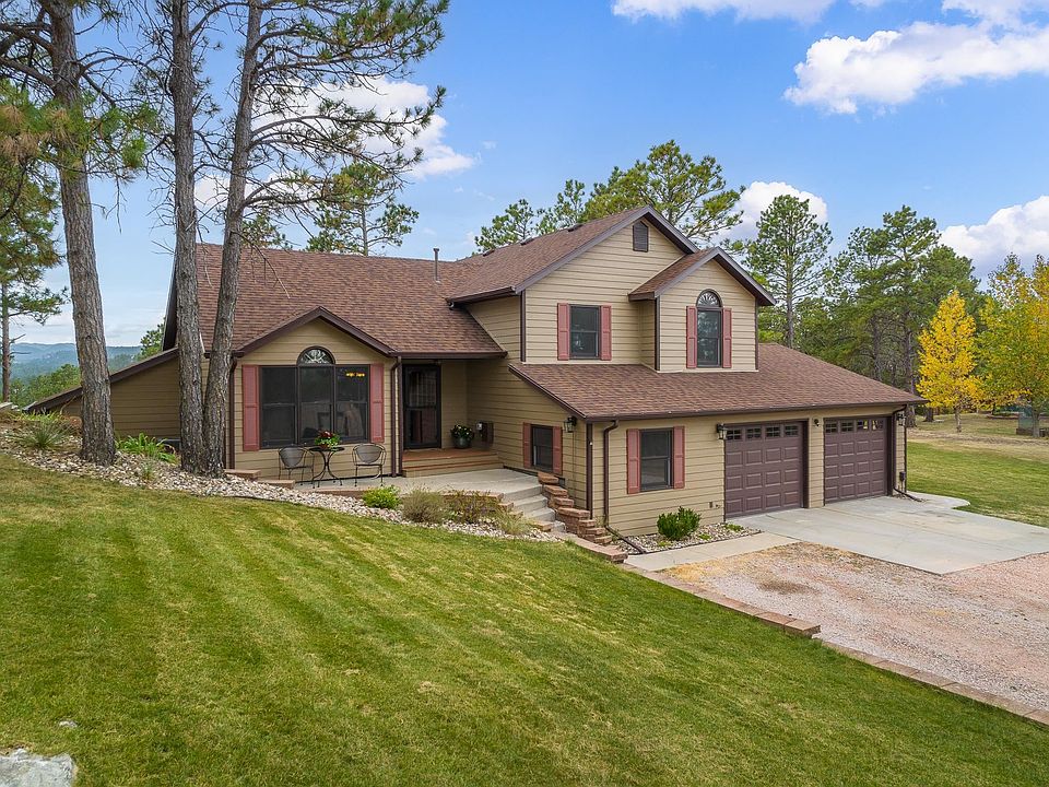 Listed by Jeremy Kahler, KWBH, 605-381-7500. Nestled atop a hill on 1.86 acres in Highland Hills subdivision, this 3-level home is ready for new owners! *Main floor in-floor heat, newer living room window panes (2020), newer water heater and roof (2019), upgraded siding and more *4 bedrooms, 3 bathrooms and 2,416sqft *Main level is great for entertaining with a comfortable living room that flows into the kitchen and dining areas, ending in a cozy sitting area *Sunny living room accented by vaulted ceilings and a large picture window *Large kitchen features ample cabinetry, granite countertops, an island for added storage and a window with beautiful views to the west *Nearby dining room for meals *Sitting room in back of the home with 2 slider doors to the back deck, showcasing Harney Peak and the ravine behind *The home's primary sleeping quarters are on the upper level, including the impressive master suite, with a spacious 2-room bedroom, oversized walk in closet with custom shelving and an ensuite bathroom with 2 sinks and a walk in shower *2 additional bedrooms and 1 full bathroom on this level *The walkout basement offers a versatile 2-room family room with gas fireplace- great for a media area and game/bonus room *1 bedroom (ntc for closet), 1 bathroom with a walk in shower and a laundry room complete this level *A few steps down into the partially finished 320sqft storage room with shelving and an area for the home's mechanical systems