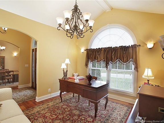 Quality construction by Jeremie Reed, this split bedroom ranch is oversized and full of detail! Stamped concrete covered entry leads to an open floor plan with arched openings & extensive millwork. Embellished in gorgeous Brazilian cherry plank flooring, the inviting foyer leads to a study or music room with vaulted ceiling on the left, and formal dining room with coffered ceiling detail on the right. Just beyond is a cozy family room with gas fireplace and built-in wet bar, which opens to the bright eat-in kitchen, featuring an abundance of cabinetry, raised breakfast bar, butler's pantry/serving bar, full appliance package and access to the covered lanai, where you'll love to grill, dine and relax year-round. The master wing includes bedroom with tray ceiling, luxurious bath, his/her walk-in closets & access to covered lanai. Two additional guest bedrooms share a full hall bathroom, finished in tile flooring. Guest powder room with furniture style vanity, and laundry/mud room, with access from both the garage and side porch, complete this level. The unfinished lower level is ready for your custom design, and includes a full egress window for BR#4, rough-in for a full bath, and lots of other living space possibilities! Other features include oversized 2-car garage, corner lot, lush landscaping with fountain, security system, one-year home warranty, and so much more! Located in the award winning Floyd Central school district with easy access to dining, shopping & expressways!