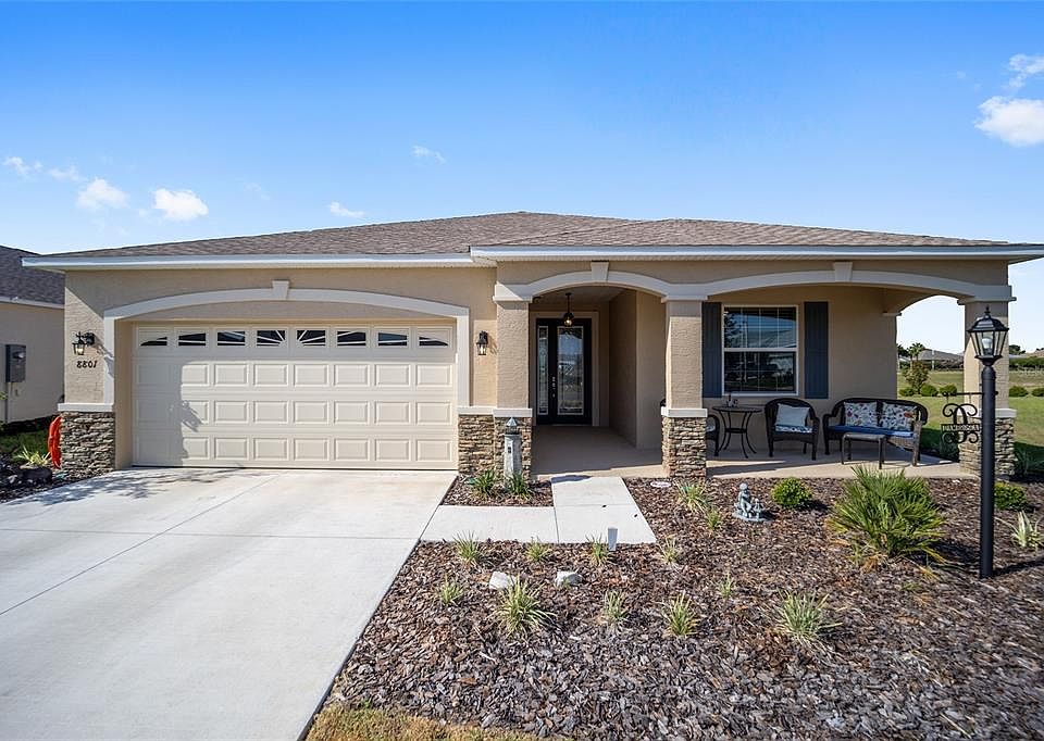 PRIVACY LOT: Don’t build a new home when you can have this 2023 “smart home” Sunflower that is still under a full builder warranty and has had many after-market options added. With 3 bedrooms, 2 bathrooms, and a 2-car garage with a four-foot garage extension, this home is perfectly situated on a dry retention pond. The stunning kitchen features under cabinet lighting, glass mosaic backsplash, granite counter, composite sink, and stainless-steel appliances. The cream colored, staggered cabinets have crown molding and feature upgrades including pot drawers, pullout waste bin, pullout spice rack, and a lazy Susan. Style abounds with upgraded paint, crown molding, and LVP throughout. The primary bedroom features an owner’s entry from the laundry room making it easy to dash from the garage to the en suite bathroom with dual vanity sinks, walk-in shower through the oversized walk-in closet. Upgraded electric includes extra recessed lighting and plugs throughout. The home also comes equipped with a GENERAC generator and a water softener. Weybourne Landing is a gated community that’s part of the On Top of the World campus and features private amenities including a swimming pool, pickleball, fitness center, and miniature golf and for a small monthly fee can also include all of the amenities at On Top of the World.