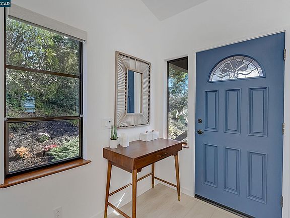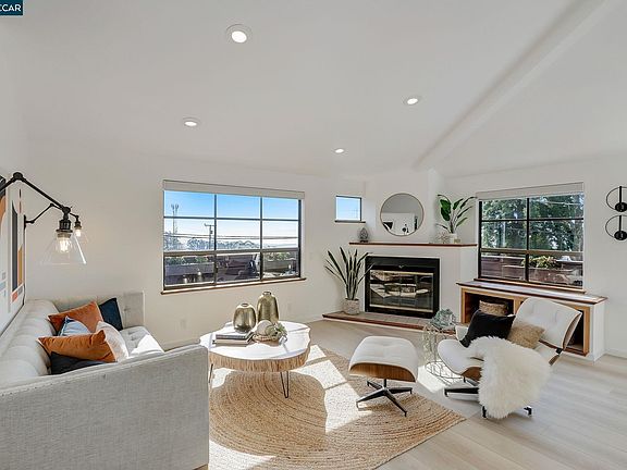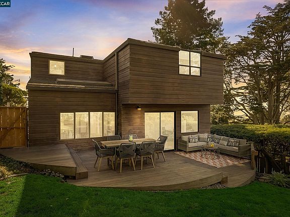 With sweeping views from the Bay Bridge to the Golden Gate, this stunning architectural home marries bold design with modern updates, offering turnkey living in a premier setting. Designed by award-winning Berkeley architect, Daniel Smith, the home’s front steps are carved into the unique serpentine rock, leading to a bright and airy home featuring vaulted ceilings, skylights, and many thoughtful upgrades. Freshly painted with newly installed luxury vinyl flooring, the main level includes a bedroom, full bath, sunny dining room, and a family room with picture window framing the Bay Bridge and San Francisco skyline. It also includes an updated kitchen with quartz counter tops and stainless steel appliances. French doors open to an additional living room on the main level with a sliding door to the back deck for indoor/outdoor enjoyment. Two staircases lead to the upper story, featuring two spacious bedrooms with vaulted ceilings and bay views, which share a marble-clad bathroom with jetted tub. The lower level features a bonus room with storage area and access to the partial garage. Soak in the gorgeous scenery from the wraparound terrace off the main level or retreat to the private backyard, with redwood deck, level lawn and lush landscaping. A truly special property!