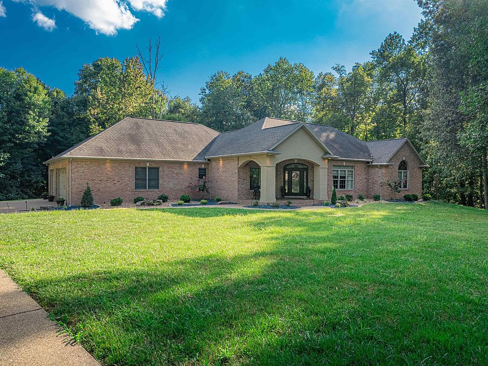 Privacy, acreage, AND storage? Located only 6 miles from USI, this 2.6 acre property has it all! This custom built parade of homes featured house is sure to impress. Enter through the covered front porch into the large foyer. You will find true hardwood floors throughout and fabulous 11 ft ceilings. The living room is great sized and features Bose speaker surround sound. The formal dining room has ornate features and opens up into the kitchen. The kitchen has custom Fehrenbacher cabinets and granite countertops. You will find a breakfast bar and breakfast nook perfect for your cup of morning coffee. The spacious master suite features tray ceilings and access to the balcony. The master bath has two separate vanities, tiled walk in shower, and a soaking tub with beautiful views of the wooded backyard. Don’t forget to check out the oversized walk in closet. Finishing off the main floor you will find three additional bedrooms each with double closets, as well as a full bath and a half bath. Heading downstairs, you are sure to be shocked at the sheer size of the basement; perfect for entertaining. Here you will find ample room for a pool table, foosball table, card table; truly whatever you can imagine! A full movie theater is waiting along with a kitchenette! You will also find an additional 5th bedroom and full bath. There is a large storage room and safe room to finish off the basement. The private backyard is straight out of a dream. This oasis features a beautiful in ground swimming pool with gorgeous surrounding landscaping. If you are looking to own a prime piece of Posey County real estate, this is your chance!