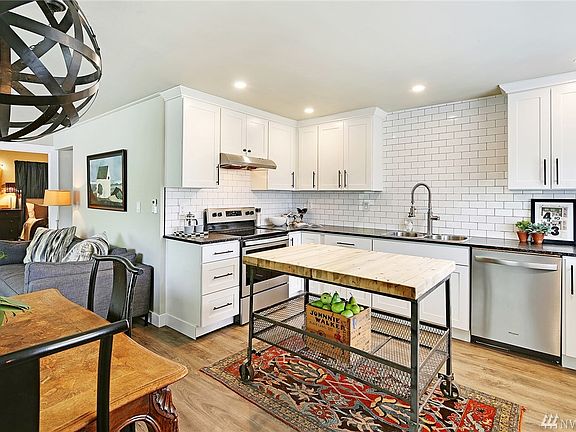 Sunny corner lot with mature landscaping invites you in. Open-concept main room flows effortlessly between kitchen, dining and living.  Updated kitchen with stainless appliances, granite counters and custom up-cycled island. New ductless a/c keeps you cool while you work from home. Wander the layers of outdoor space - the charming front porch, the private oasis side yard and expansive, fully-fenced backyard with raised garden beds and fruit trees. One car garage AND rare off-street RV parking.