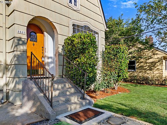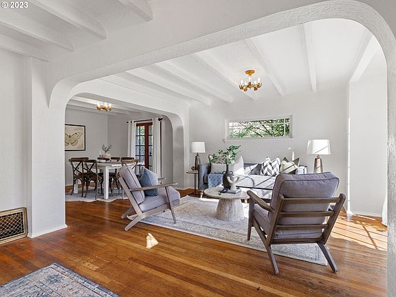 This Dutch Colonial home will have you smitten with classic period details at every turn. The 2,213 square foot layout includes three bedrooms on the same level, one bathroom, and a large partially finished basement with much potential for additional build-out. Within the first steps from the arched front door, the beamed ceilings immediately grab your attention and span through the open-concept living and dining room. Fantastic light peers through the leaded glass windows with beautiful stained glass art. You'll love the thoughtful and modern updates in the kitchen and bathroom + the system upgrades with a new roof, electrical panel, sewer, furnace, and water heater. Head upstairs to the large primary bedroom with double closets and a built-in window seat. Cherished features include built-in storage in the bedrooms and wood floors on the main and upper levels. Perfect for entertaining with a large and fenced-in backyard with mature fig trees. Located in central Portsmouth, close to the community gardens, New Seasons Grocery and restaurants, and between three parks with pickleball courts, splash pad, and playgrounds. [Home Energy Score = 1. HES Report at https://rpt.greenbuildingregistry.com/hes/OR10221704]