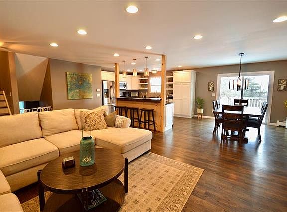 This split level home has 4 bedrooms, 3 full bathrooms, open concept living, kitchen and dining area, family room, 2 car attached garage and amazing views from the tiered deck. The first floor is the living space that is open, airy and modern. There is a wood burning fireplace in the living area. The dining area has sliding doors that lead out to the spacious deck. In the kitchen you will find black quartz counters with island seating, pull out shelving, soft close doors and stainless steel appliances. Master bedroom is en suite with shower, large closet and sliding doors leading out to a private balcony. 2 more bedrooms and full bathroom are on the 2nd floor. The family is room on the lower level and has resilient flooring and lots of natural light. There is also another full bathroom and bedroom with closet and sliding doors to its own private deck. One more level down and there is a basement area with laundry hook up, bilco doors and the homes mechanics. Only minutes to I80.