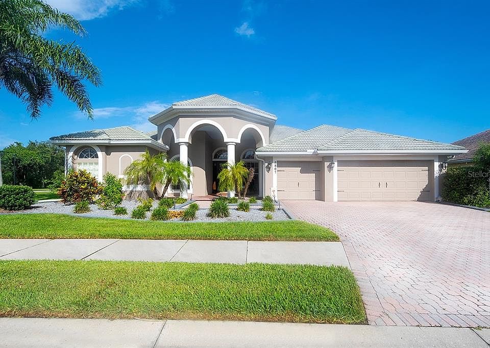 Indulge in Luxury living in this Elegant Strauss model in Gated Stoneybrook at Heritage Harbour! This Gorgeous mediterranean style Pool home boasts 4 bedrooms, 3 baths, office, 3 car garage, fabulous lake and golf course view and much more! Many upgrades include a new 2 zone HVAC system with 2 air handlers (2022), most lights are new, new fans, toilets, sinks, gutters, freshly painted exterior, garage cabinets and more! Also has a barrel tile roof and hurricane shutters! Upon entering you will notice the amazing openness with high ceilings and special architectural design features! Living room is open to dining room and has 8' sliders with transom windows to pool area. A few steps further you'll find a chef's delight kitchen with plenty of granite counter space, 42" maple cabinets, new SS appliances, new faucet, breakfast bar, telephone desk area, recessed lighting and large pantry. Also enjoy casual eating in your breakfast nook with fabulous aquarium window overlooking pool! Kitchen opens to a generous Great rm with electric fireplace, high ceiling, ceiling fan, recessed lighting and triple sliding glass doors to lanai. Retire to your spacious Primary bedroom with 2 large walkin closets, a wine/coffee bar with 42" cabinets, reading nook, tray ceiling, access to office, ceiling fan and 8' sliders to lanai! Primary bath offers large granite vanity, dual sinks, soaking tub and tiled shower. Access office from foyer through double doors or primary bedroom. 3 more large bedrooms, 2 more bath rooms with granite and also a wonderful hobby/extra office area with lots of storage and workspace. Relax by your heated salt water pool with raised spa and enjoy incredible sunsets over peaceful lake and 10th hole green! Pool tile has been regrouted and all pool equipment replaced in the past 5 years! Pool bath too! Utility room has sink with granite vanity and cabinets. Extensive landscaping also adorns this home's exterior with newer curbing, plants and solar lights. Plenty of room in your 3 car attached garage! One year home warranty! Live like you're on vacation year round with Heritage Harbour Golf & Eatery with 18 hole golf course and no mandatory golf fees! Memberships are available or pay as you play! Spend time at the heated resort style pools, spa, splash pool, tennis/pickleball courts, active club house, fitness center, beach volleyball, basketball courts, bocce ball, corn hole, shuffleboard, dog parks, playgrounds and picnic areas. So much for such low fees!! Stoneybrook is close to Anna Maria Island's beautiful beaches, Siesta Key, downtown Sarasota and Lakewood Ranch, plenty of restaurants and shopping, I75, Tampa, St Pete and airports! Welcome to Paradise! Note: CDD fee is already in the tax figure.