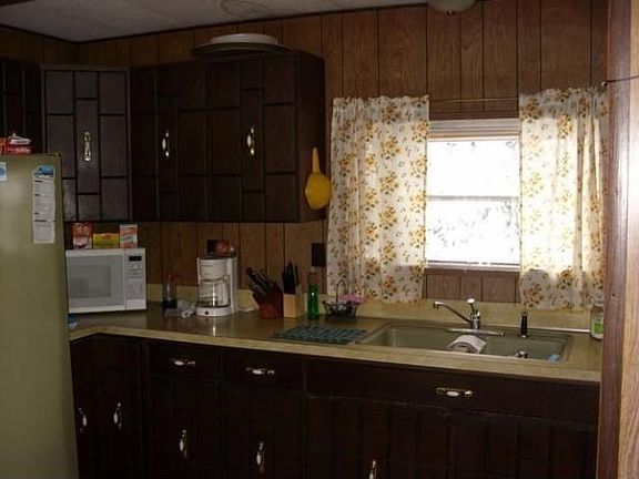 YOU CAN'T GET ANY MORE PRIVATE THAN THIS! Surrounded by mature pine trees the house isn't visible from the road. Over an acre lot, 1.23, with two garages and a 80' windmill that supplies energy to the trailer house. House has 3 bedrooms 1.5 baths, full bath needs toilet put back in, large deck off the back has a ramp for easy access. The second garage has patio doors and is presently being use for storage, but would be great as a workshop! Windmill works and helps reduce the energy bills. Or build new!