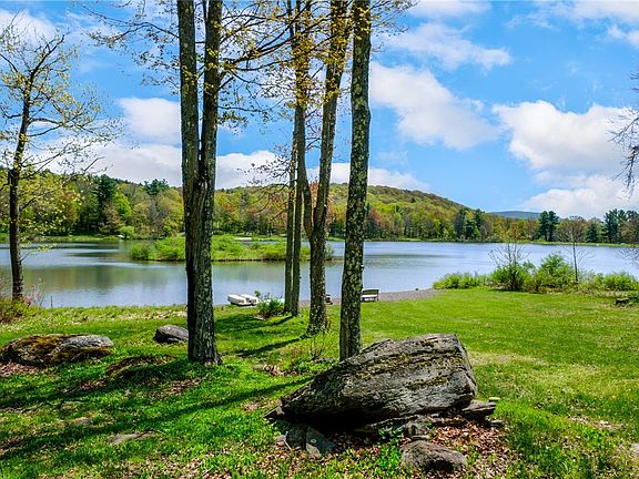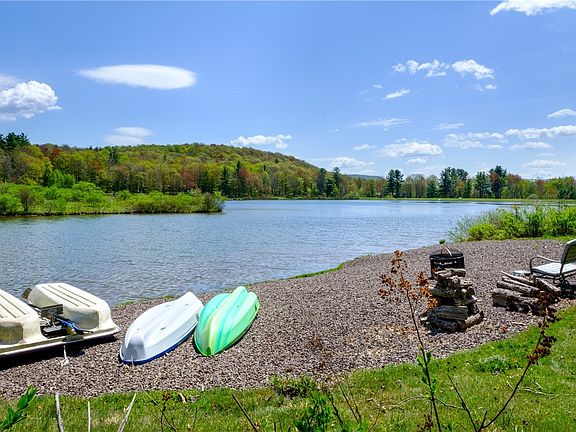 A gorgeous lake view awaits you. Enjoy a gently sloped lawn from back yard to lakeside beach. MOVE-IN-READY with FIBER-OPTIC - great for the HOME OFFICE. Cathedral-ceiling GREAT ROOM is open concept kitchen - dining - living space w slider to partially COVERED DECK overlooking lake. New wood floors for bright, clean look. VERMONT CASTINGS wood stove to heat entire house! Kitchen is well-appointed w dishwasher, oven/range, and refrigerator all conveniently located behind an angled isle - great for entertaining while cooking. Crisp lighting and new hardware give a modern appearance. Also on this main floor are 3 bedrooms and a spacious full bath. Upstairs is a terrific 4th bedroom. One thing that makes this house special and different from others in this community is the BASEMENT. A great laundry, hobby shop and a workshop AND A HALF BATH make this space super useful. Carefully tended perennial gardens landscaped with native stone make for a super pleasant lawn. Minutes to the villages of Stamford, Hobart and Delhi, and under 3 hours to the GWB.
