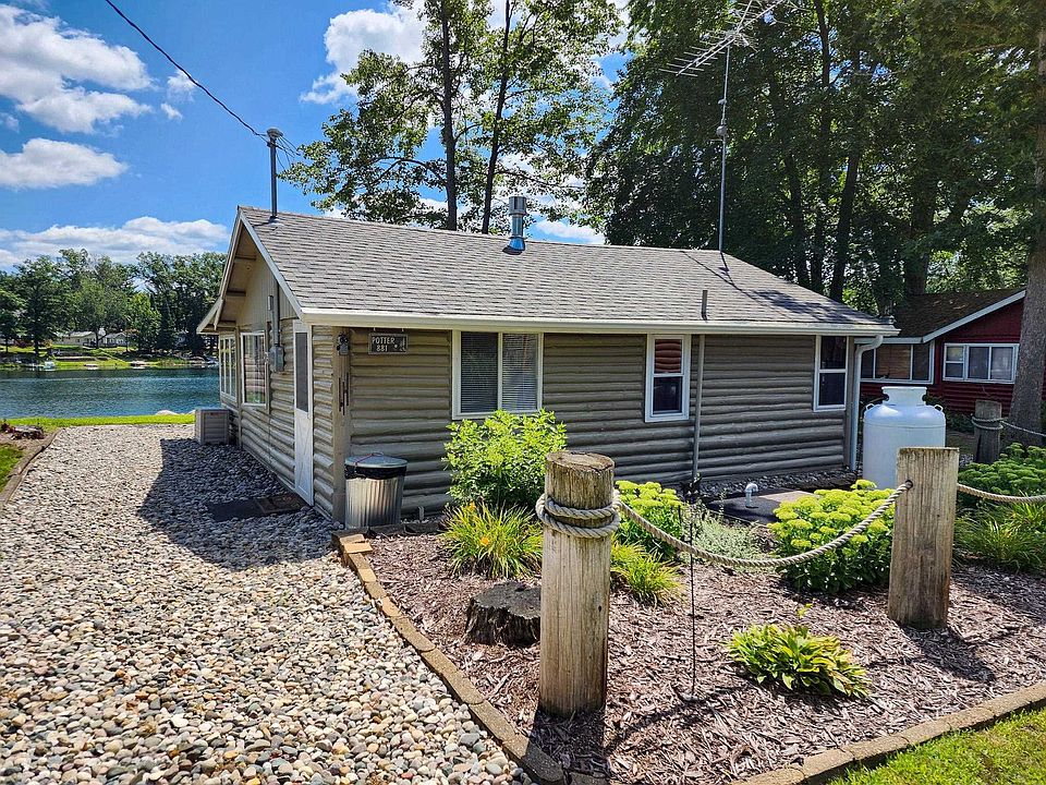 Charming and well-maintained 2-bedroom, 1-bath log home located on the serene, no-wake Blue Gill Lake. This home offers a cozy thermostat-controlled propane fireplace, a stone driveway, beautiful landscaping, and a lovely rock wall surrounding the firepit. Enjoy kayaking, boating, fishing, and swimming right from your doorstep. Recent upgrades include a shingle roof installed in 2017 with a rubber roof over the sunroom, a new water heater in 2020, and updated holding tank and well pump between 2017 and 2019. The home comes mostly furnished, including most wall decorations, kitchen dishes, and shed items. It also includes a dock, boat with electric motor, and all appliances. The sellers are leaving almost everything—just bring your toothbrush and start enjoying!