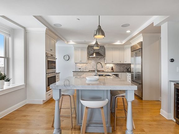 Penthouse perfection! Bright & sunny corner unit with over 1,872 square feet featuring 2 bedrooms plus office and 2.5 baths. THREE HEATED GARAGE SPACES plus deeded extra storage space. Jaw dropping city views from the expansive private roof deck, equipped with a direct gas line and an outdoor TV! Exercise space for Peloton or treadmill in the head house equipped with wet bar and wine fridge for easy and memorable entertaining. Chefs kitchen showcases inset cabinet doors, Sub Zero refrigerator, under cabinet lighting, Wolf double ovens and stove top, as well as a 10'-foot kitchen island that opens to a large, light filled corner living room with gas fireplace. Master bedroom features an impressive walk-in closet and spacious en-suite bathroom including a steam shower, double vanity, and a separate soaking tub. Other in-unit features include 3 zones of built-in audio, 2 zones of Central Air with Nest thermostats, and full-sized stacked washer and dryer. 1 block from water & 3 parks.