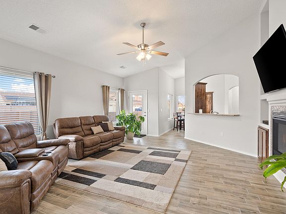 Welcome to Los Lunas, NM! This delightful 3BR/2BA residence is situated on a corner lot with a 2-car garage. Inside, experience the allure of vaulted ceilings, a fireplace, and built-in shelving. The kitchen is adorned with dark-colored cabinetry, SS appliances, and a pass-through window. Enjoy the blend of carpet and tile flooring, along with the convenience of refrigerated air and a dedicated laundry room. Retreat to the master bedroom featuring a double sink vanity, a garden tub, and a walk-in closet. The backyard is your private oasis, complete with a covered patio, a concrete deck, and a brick wall for added privacy. Plus, embrace sustainable living with solar panels enhancing the energy efficiency of this charming home. Don't let this opportunity pass - schedule your viewing today!