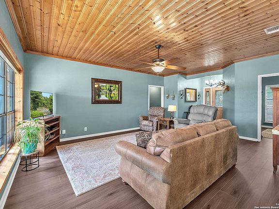 Experience peaceful lake living in the heart of the Texas Hill Country - just 20 minutes from San Antonio's newest thoroughfare at 211 and FM 471. This thoughtfully crafted home offers easy lake living with all the comforts you need. Featuring 3 bedrooms, 2.5 baths, and spacious open living areas, the layout feels bright, functional, and welcoming. The kitchen offers generous counter space, ample cabinetry, and beautiful granite countertops, perfect for gathering and entertaining. When the lake is up, step right from your backyard into days of boating, jet skiing, and swimming. A private dock is available and negotiable with a strong offer, making water access effortless. Enjoy outdoor living year-round with an above-ground swimming pool, a covered patio with a convenient half bath, and plenty of space to relax or entertain. The home's charming details-like beadboard ceilings, wood-like tile flooring, and thoughtful craftsmanship-add warmth and character throughout. A two-car attached garage, two-car detached garage, and covered parking for an RV or boat offer plenty of storage and flexibility. The property includes a private well and septic system, ensuring comfort and independence. Whether you're seeking a full-time retreat or a weekend getaway, this home blends tranquil lake life with modern convenience in one of Medina Lake's most peaceful coves.