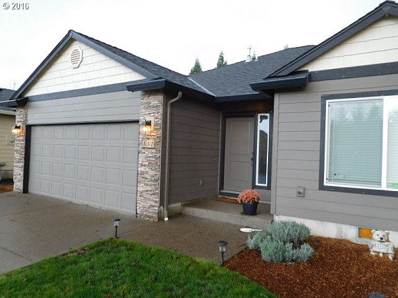 Lovely 2012 home on large corner lot. Granite island kitchen with stainless appliances and pantry. Vaulted great room with dark wide plank floors and gas fireplace. Vaulted master suite with large walk-in closet and double vanity. Baths have tile counter tops and floors. Both guest bedrooms have walk-in closets. Wonderful home for entertaining! Large back yard with huge 12x43 foot patio with power hook up for a hot tub. Gas furnace with