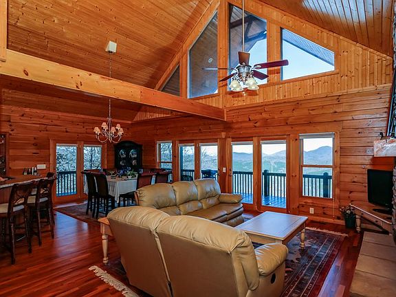 Year-round mountain views - beautiful custom log home located in the gated community of The Summit. This one owner home was designed with everything needed for a full time mountain lifestyle including garage parking! Plenty of windows allow sunlight to fill the open living area as you enjoy the stellar mountain views. Great room with stacked stone fireplace. Cooking is a pleasure in this kitchen with granite countertops, ss appliances including wall ovens, warming drawer & beverage cooler, raised bar island. 2 bedrooms and a full bath complete the main floor. Upper level boasts a spacious master suite including sitting area perfect for private den or office. The master bath has double vanity, jetted tub and separate shower plus large walk-in closet. The lower lever has spacious family room with gas log fireplace and French doors to access the patio and enjoy the views. Full bath, laundry room and office/craft room also on lower level. Wrap-around porch, 2 car garage, selling with 2 lots totaling 3.93 acres, paved roads, low HOA fee. Furnishings are negotiable.