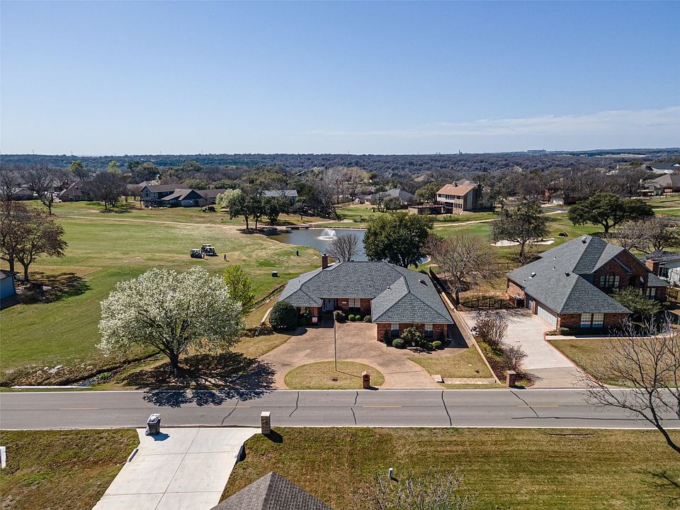 GOLFER’S DREAM HOME overlooking 17th green and pond in Pecan Plantation! Well maintained property in established neighborhood near clubhouse and marina. Functional floor plan; crown molding. WBFP is focal point of spacious living room. Breakfast room, with charming built-in buffet and display shelving for china, and classic, covered back porch are favorite spaces for enjoying panoramic views of the golf course. Kitchen boasts abundant cabinetry, a handy island, and a generous amount of countertop space for food preparation. Formal dining room could also serve as an office. Handsome and practical wood laminate flooring in living, dining, kitchen, breakfast area, and all bedrooms. Spacious primary bedroom; beautiful, tiled en suite. Large utility room. Oversized garage with separate entry golf cart space. New Class 4 shingle roof and gutters installed in Feb. 2024; HVAC replaced in 2020. Sprinkler system. Minutes from historic Granbury square and lake. An hour’s drive to Cowtown.
