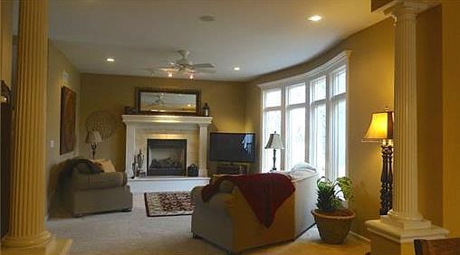 Elegant home on one of the best lots in outstanding Woodneath Farms. Great view of the large, treed lot. Interior features open plan with high ceilings and perfect flow for entertaining. The open kitchen has granite, Jen Air appliance, and spacious, cozy hearth room with second fireplace. Large bedrooms are near convenient upper level laundry room. Lower level features built-ins, living and exercise spaces, full bath, wet bar, and multiple storage areas. Southern exposure on flat driveway. Outstanding home.