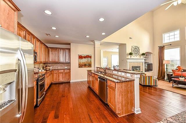Beautiful craftsman style home features open floor plan, 2 story great room with vaulted ceiling, brand new gorgeous hardwood flooring throughout main level, architectural details, high ceilings, columns, arched doorways, office with French door, huge designer kitchen with stunning granite countertops, State of the Art stainless steel appliances, custom cabinets, expanded breakfast bar, butler pantry corner. Great room has built-in entertainment area and warming fireplace. Fall in love!