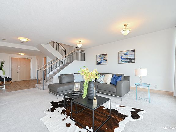 Rare Offering! Stunning two-level penthouse boasts breathtaking 270 degree panoramic views of majestic mountains and city skylines from every room! Spanning 2,400 SF, this home offers house-sized living, featuring a grand foyer entrance, formal living room, and three private outdoor spaces. The gourmet kitchen is equipped with full-wall cabinetry and flows seamlessly into a spacious dining area, cozy family room, and powder room-perfect for entertaining. Premium amenities, including outdoor pool, gym, games room, guest suite, and concierge services. Two huge sidebyside parkings, huge locker.