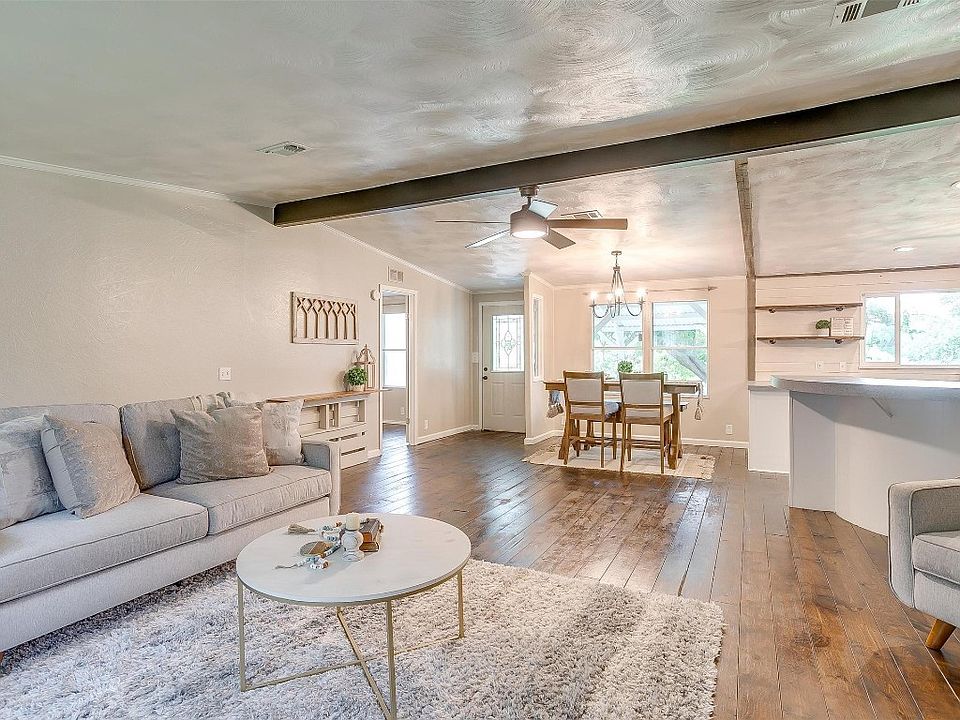 Beautifully remodeled home on large lot! Home boasts open floor plan with a spacious living room, two fireplaces and bonus space can serve as formal dining or den. Kitchen has endless storage, large island and floating shelving. Utility is separate and has full washer and dryer hookups. Yard is fully fenced with multiple storage and parking options and trees! Chicken coop and fire pit in the back!