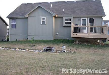 The property has trees. The house was built in 2010. This three bedroom, possible 4th bedroom, with 2 1/2 bath is a smoke-free house. The 4th bedroom/family room/basement has a 1/2 bath with a hidden storage area. Tiled bathrooms and entry-ways. The mud room has convenient storage and seats. Two bay, extra wide and deep garage is equipped with garage door openers, keypads located outside of the garages.Storm doors added to the front and back. Wide stairway with wooden Hard-wood floors throughout the kitchen and dining area with eat-in bar. Brand new dishwasher. Plenty of counter and cabinet spaces. Very spacious, open-concept floor plan with cathedral living room and entry way ceilings. Gas fireplace. New ceiling fans, one is remote controlled.Master bath has two sink vanity and walk-in closet. Vaulted ceilings in master room. The furnace is equipped with a humidifier.Applicances (Refrigerator, washer and dryer) are negotiable with the price.Recent appraisal. Comes with a one-year home warranty.Additional property info: http://www.forsalebyowner.com/listing/3-bed-Single-Family-home-for-sale-by-owner-8812-NE-117TH-St-64157/23965786?provider_id=28079