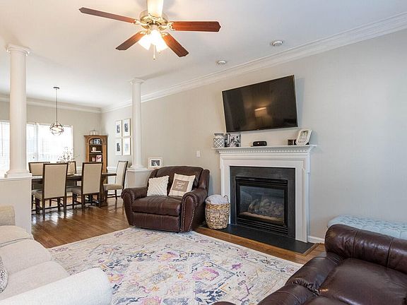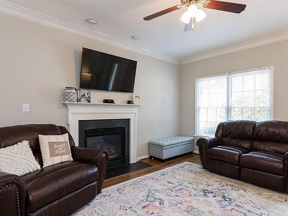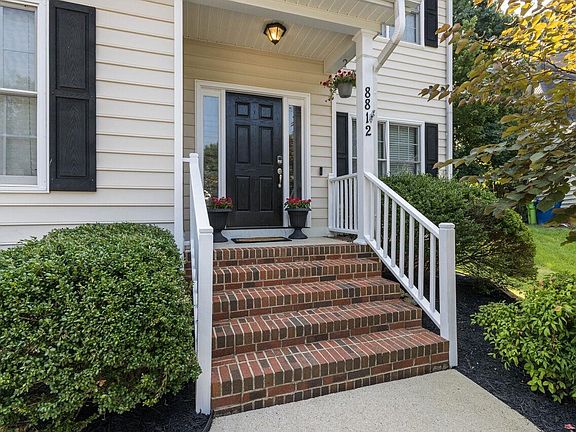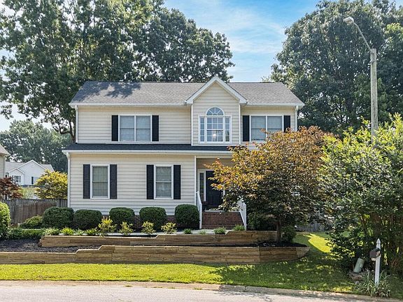 Desirable home in popular Woodlawn Community! This wonderful 4 bedroom home features hardwood floors throughout, upgraded kitchen with granite countertops, tile backsplash & stainless steel appliances. Spacious living room w/gas log fireplace. Primary suite features tray ceiling, two closets & private bath w/garden tub, double vanity & separate shower. 2nd floor bathroom has new flooring. Low maintenance vinyl siding. New door on attached 2 car garage. Fenced backyard & large deck are great for entertaining! Located conveniently to Brier Creek, I-540, RTP and RDU.