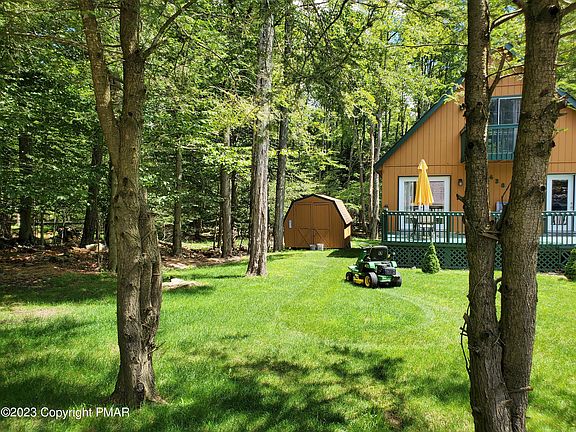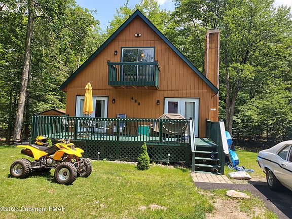 Picturesque chalet nestled in the quiet woodland. A perfect family vacation spot and Airbnb friendly. This house offers endless opportunity. The spacious loft can be used as a 3rd bedroom and still have room leftover for a game or bonus area... your choice. The plumbed basement has potential for over 700 sq feet of added living space. Add peace of mind with public water & sewer and low taxes. Only a short walk to the community pool, tennis courts, playground & community lake. Cozy up to the wood burning fireplace or the pellet stove in the wintertime. Enjoy a cup of brew on the 2nd floor balcony or out on the deck. Minutes from Rt 80, shopping, water parks & ski resorts like Camelback, Kalahari, Great Wolf Lodge and Mt Airy Casino. I would