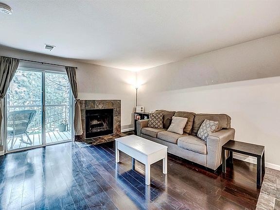 Fantastic, updated & perfect for your first time buyers. Open floor plan. Slate floor in entry & kitchen. Wood floors in Living room with wood burning fireplace for warm winter evenings. Open kitchen adjacent to LR has granite counters, newer black stove, refrigerator, dishwasher & microwave. Also includes stackable washer & dryer. Room for stools at the eating counter. 1 large bedroom with private door to bathroom (bath also accessible for guests via second door). Bath has newer tile surround in shower, granite counter & updated components. All work was professionally done and looks fantastic. There is also a very large deck with 2 storage units (1 for the furnace and 1 for storage.) You can access the deck from double sliders in the bedroom or from the double sliders in the living room. Balcony overlooks greenbelt and is perfect for morning coffee & afternoon barbeques. 1 assigned parking space and ample guest parking within a very short distance.