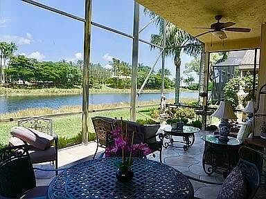 WOW!!!BEAUTIFUL LAKE VIEWS are outstanding from this much sought after location with no neighbor homes in sight! Enlarged screened lanai overlooks the LONG PEACEFUL lake, open to the kitchen & family room. ALL NEUTRAL TILE, NO CARPET! The outside & inside blend perfectly In this well designed Valencia floorpan! White cabinets, stainless, accordion shutters, granite, his/her sinks, great views & walking distance to state of art fitness center, grand social clubhouse, tennis, pickleball, bocce,more! Restaurant, spa, beauty salon, resistance pool & lap pool compliment the grand pool, with happy hours, full time social director, clubs, shows, extremely active lifestyle for the 55 plus! Hoa dues include cable, internet,outside painting of home, security, lawn maintenance,more! LOVE this one!