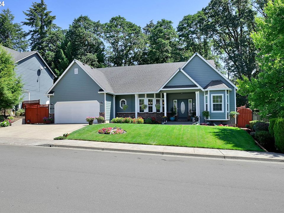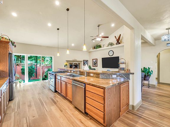 Meticulously cared for contemporary home with gorgeous features throughout! Upon entering, you are greeted by vaulted ceilings, arched doorways, tasteful, luxury vinyl plank flooring and a fantastic open floor plan! Living room has an electric fireplace that can operate with or without heat. Kitchen features high end granite counters, a huge island with a gas range and stainless-steel built-in dishwasher, microwave and refrigerator. 2023-installed, sizeable, stainless steel kitchen sink. Seller converted a nearby closet for pantry use. Lovely primary suite with tray ceiling, gorgeous remote controlled ceiling fan, window seat and a large bathroom with double sinks, walk-in closet, and a 6 x 6 custom made walk-in shower with 3 shower heads!! Pleasing floorplan with 2 additional bedrooms on opposite side of house featuring high ceilings and ultra-soft carpets. Laundry room has built-in storage and a utility sink. Central vacuum system! Private, fenced backyard has a 4-person hot tub, raised flower beds, Japanese Maple trees and a large toolshed. Absolutely beautiful curb appeal and in a well-cared for neighborhood! Parking pad on side of house! Close to schools, restaurants & shopping and Fern Ridge Lake. 20 minutes to downtown Eugene! This home is a must see to appreciate all of its special features.
