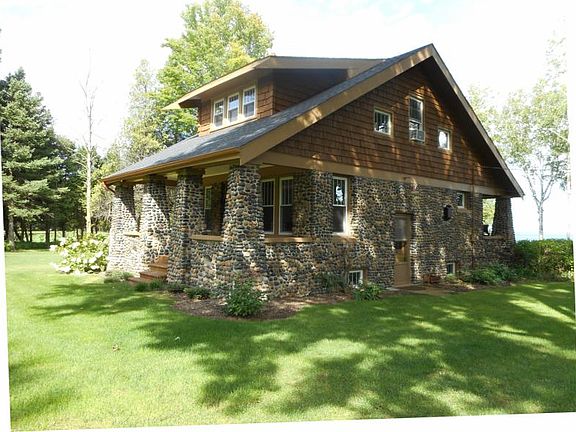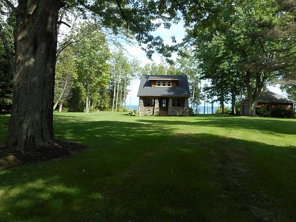 Spectacular, Cobblestone home, renovated from the studs out. 2 or 3 bedrooms, Beautiful bright kitchen. Vintage charm with modern amenities, 9 foot ceilings, gas fireplace, open staircase, stunning new tile bath, Home has been completely redone with quality in mind. new windows, plumbing, roof, wiring, Cobblestone exterior with redwood trim and hand split cedar shake shingles above the stone. 2 delightful covered porches. Easy walk down the path to the nice sandy beach. Very pretty setting opens up after driving through the canopy of trees 1400 feet to the house. Have to see this one to believe how gorgeous it is. New furnace just installed and prepped for air.