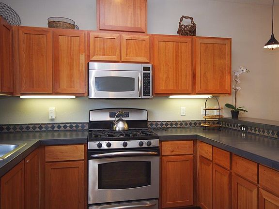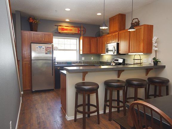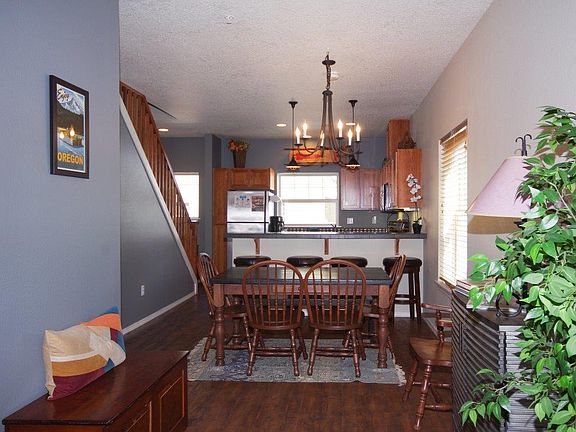 Mt. Hood VIEW END UNIT & 3rd bunk room/den room no closet. Luxury vinyl plank on living level. Cherry cabinets & tile counters, backsplash & bfast bar in gourmet gas kitchen w/stainless appliances. Fully furnished/turn-key adjacent wooded area. View Mt. Hood from kitchen, living & front bedroom windows. Great amenities. Exclude Pendleton art in Living Rm & white bedding, bath, kitchen & pool towels. Newer cookware/kitchenware & interior paint. Fireplace has blower.