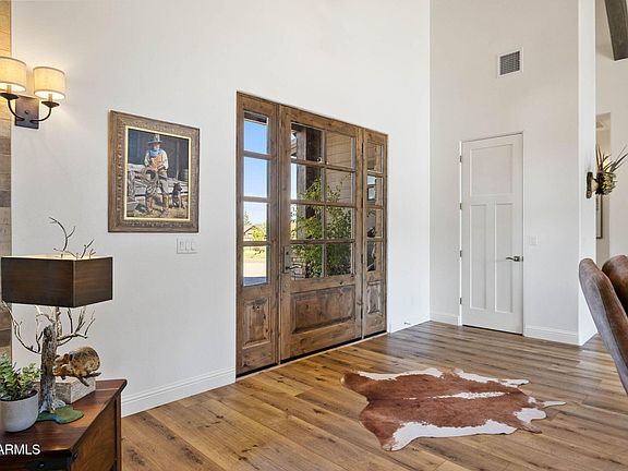 A Masterpiece of Design with Unrivaled Views of Granite Mountain. Perched to capture sweeping panoramic views of Granite Mountain, this extraordinary custom-built 2023 residence by Hughes Building Co. redefines luxury living in the prestigious gated community of American Ranch. Every detail of this 3,046 sq ft single-level home reflects exceptional craftsmanship and designer-selected finishes, blending rustic elegance with modern sophistication. The chef's kitchen is a culinary showpiece, showcasing an oversized Wolfe 8-burner range, oversized Sub-Zero refrigerator, Wolf double ovens, pot filler, dual sinks, and a morning pantry with an additional refrigerator and wine cooler. The open great room is anchored by soaring beamed ceilings and a striking floor-to-ceiling stone fireplace. Relax in the 16' x 30' heated swimming pool with an automatic safety cover, surrounded by the beauty of nature. The fenced backyard includes turf and a dog run, blending function with elegance. For car enthusiasts or hobbyists, the estate boasts a 918 sq ft three-car