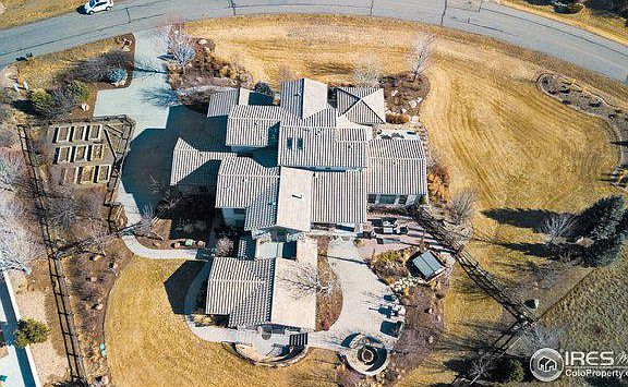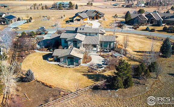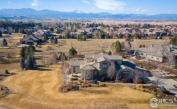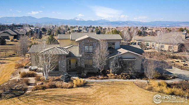 Close-in country Mediterranean style home on a well landscaped acre site in "Portico". Over 7,400 sq ft of finished space, room for extended family. Country style kitchen with raised paneled custom cabinetry, travertine marble countertops, 12' island for informal dining and food prep, and Thermador appliances. Master retreat features cathedral ceilings, fireplace, Long's Peak views and luxury bath. 3 ensuite bedrooms on upper level and 5th bedroom on garden level. Full gym with cork floor on walk-out garden level. Extensive outdoor entertaining areas with hot tub and firepit. 4 car heated garage