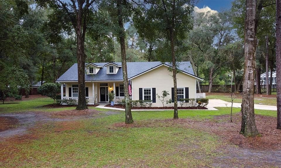 Come see this meticulously kept bright Contemporary (3 BR+Office/2 BA Split Plan, 1724 SF, Built 2004) on peaceful acre in Kanapaha Pines with hardiboard construction. New shingle roof in 2022. Covered front porch. Family room with high ceilings, new vinyl plank wood flooring throughout (2021) & wood burning fireplace. Open kitchen with wood cabinets, stainless steel appliances & large breakfast area. Walk-in closet & tray ceiling in master bedroom. Jacuzzi tub & separate shower in master bath. Lots of windows to enjoy the wooded views. Inside laundry room with tile floors. Side-entrance double garage w/pull-down stairs to attic access. Irrigation system and gutters. Enjoy the sunsets on your private screened Lanai! RV electric hook up on property as well. Convenient to UF, Shands, shopping & schools.