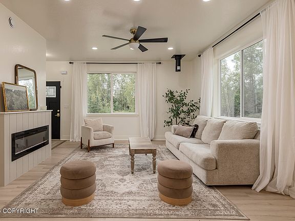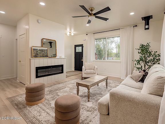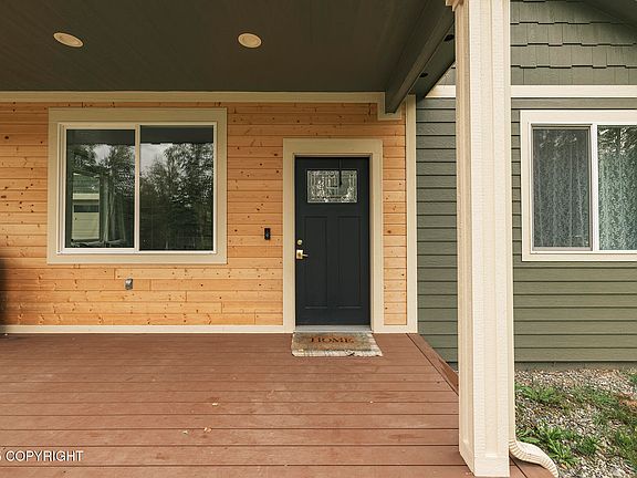 Modern comfort meets Alaskan living in this thoughtfully designed home! Step inside to find 9ft ceilings, LifeProof LVP flooring, and a cozy electric fireplace. The kitchen and bathrooms shine with quartz countertops, while both bathrooms feature tiled floors and tub surrounds. The spacious master suite has a 72'' double vanity and a MAXX soaking tub. This is a Must see! Schedule a showing today!Comfort is built in with radiant in-floor heat throughout the home and garage (plus garage heater backup) and a full HRV system for fresh air year-round. A wood stove pipe is already installed if you'd like to add extra warmth. Outdoor living is a dream with TimberTech front and rear decks (rear deck hot tub-ready), a fully cedar-fenced yard, and an outdoor hot water spigot for recreation and easy cleanups. The lot is 90% cleared, offering a huge gravel backyard perfect for toys, gatherings, or future projects. This home is loaded with upgrades and built for year-round enjoyment!