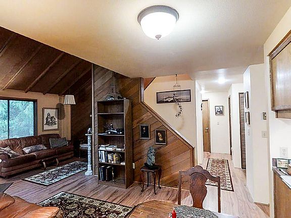 1st time on the market! This lovely home is nestled in the trees with 4 decks to take in the gorgeous views. Walls of windows, newer vinyl plank floors in living area and a cozy pellet stove that heats the entire house well! Master suite on main level with french doors to private deck to enjoy coffee in the forest. 2 car garage, large 3rd bedroom/bonus room on upper level could easily be converted into an amazing master suite. Complete privacy within a short distance from town.