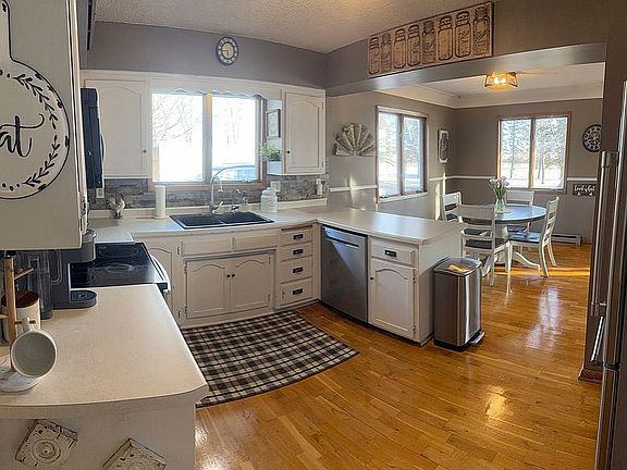 Many recent updates including new roof, new central air, whole home water system with Iron Filter w/RO, new well pipe and pump, updated septic and all stainless steel appliances. 3500 sq feet of living space-which includes sauna, theater movie room w/projector, wet bar and lots of storage space. 40’x64’ Pole Shed fully finished with large 3 stall shop space with offices/kitchen/bathroom area attached. Last 6 photos show Pole Shed/Shop Area and Attached Kitchen/Office areas. Lots of updates throughout property.
