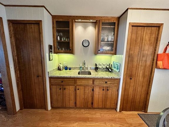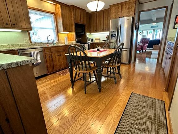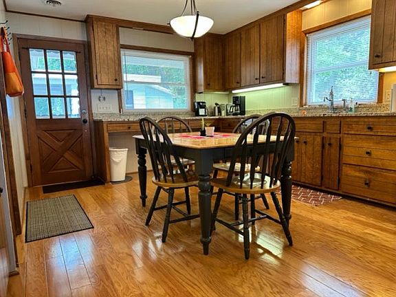 Watch the sunset from your brand new waterfront deck! This three bedroom, 2 bath home has a spacious family room with an abundance of windows to capture those priceless lake views. The updated kitchen offers a breakfast bar as well as a wet bar and has plenty of counter space & cabinets. There's also a wood burning fireplace for chilly summer nights or an indoor s'more! Outside there is a stone patio and carport- great for rainy days, a neat little laundry room and separate storage area. Many of the windows have been replaced, the primary bath is updated and there are beautiful hardwood floors.
