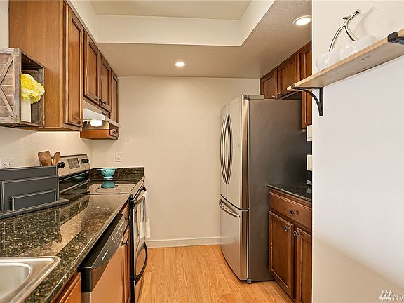 Wake up & walk to Monkey Grind cafe & eat at Woodlands Pizza. Just close enough to the freeway it takes min. to get there, but far enough you never hear it. W/ a walk score of 79, bike score of 74, leave your car at home in a secure garage & enjoy the summer. Abundantly sized rooms w/ space for your king bed & 72 in. TV fits perfectly over the FP. All the convenience of the city being minutes to Amazon, Greenlake & Greenwood. Updated kitchen, sparkling countertops & SS appliances. Don't miss it!