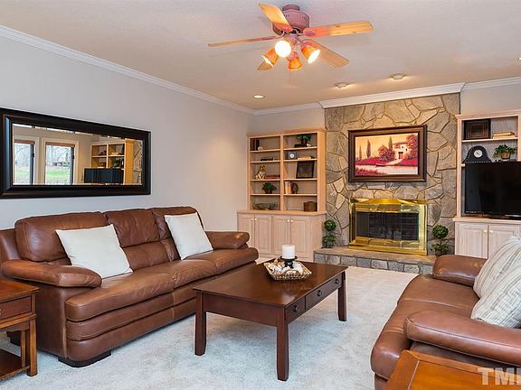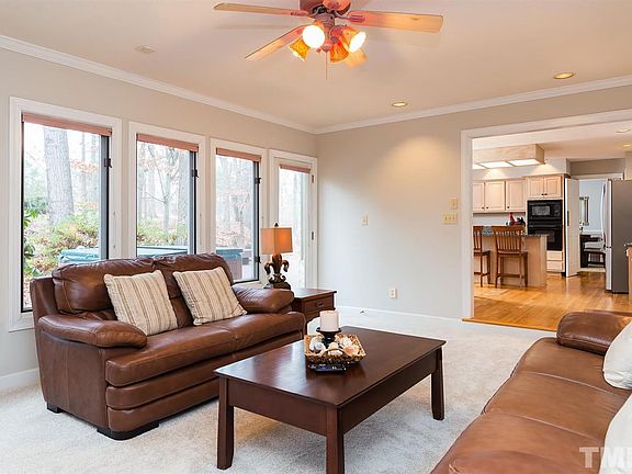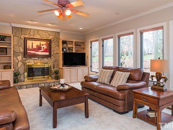 Lovely home on golf course lot. Gleaming hdwds, 2 story foyer w/skylight, formal rms, lrg kit w/island/bar & breakfast area w/access to deck. Adjoining step down fam rm w/gas log stone frpl, built-ins and access to hot tub. Spacious master has beamed cath ceiling & private whirlpool bath w/dual vanity & walk-in closet. Huge 3rd flr w/skylights, built-ins, walk-in closet & walk in storage access. Walk-in crawl space for more storage. Enjoy the comm pool, tennis & playground. Easy access to I-540, RTP & RDU