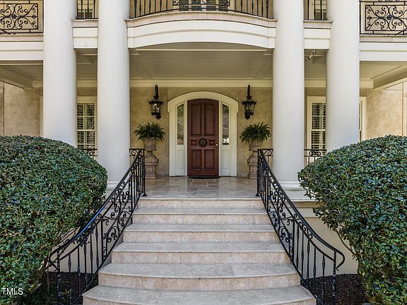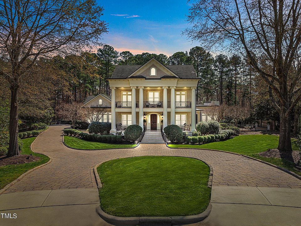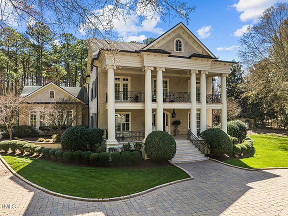Located in North Raleigh's highly sought after Richmond Hill community that is easily accessible to everything including I-540, RDU, RTP & North Hills. This Georgian style estate exudes southern charm, and is nestled on a .89 acre private cul-de-sac. Custom built by premier builder, Mike Young. Serene setting with extensive formal gardens, gorgeous balconies to enjoy the outdoors, a large gazebo w/music, fire pit, 2 fountains, paver patios & walkways. Gourmet chef's kitchen w/top of the line professional appliances including paneled Sub Zero 36'' refrigerator & 36'' freezer. Owners retreat w/Mahogany wet bar, fireplace, private balcony, private library. Owners spa bath w/2 separate built-in Mahogany Veneered Vanities, large Spa style shower & custom tilework. All bedrooms w/private balconies. 4 interior fireplaces. Plantation shutters throughout. Freshly painted interior. White Ash hardwoods throughout 1st & 2nd floor & in basement. Exquisite wood work throughout the interior. Dencor energy management system. Lutron/Crestron lighting system. Whole house audio. 3rd floor movie/bonus room. Full basement w/billiards room, antiqued pub bar from Ireland, 750 bottle wine cellar, spa bath w/steam shower, exercise room. Spacious yet comfortable with lots of flex space to adapt to the needs of everyone. 3-car garage w/workstation & built-in storage.