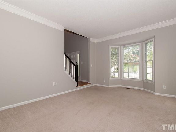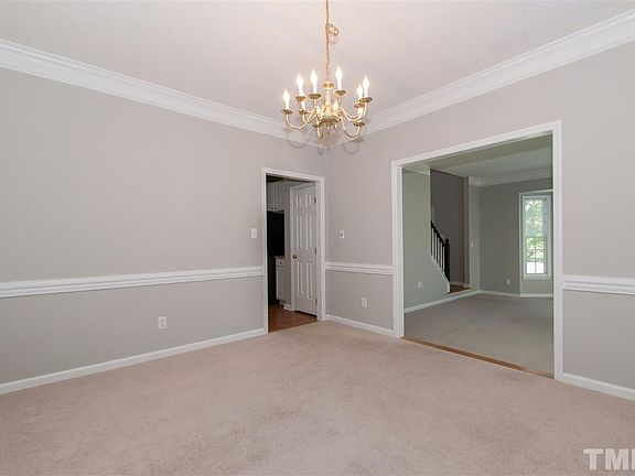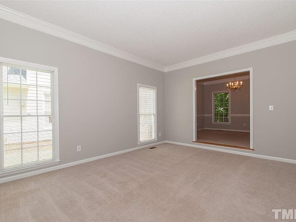 Spacious move in ready home. Sunken formal living rm, formal dining, Lovely hdwd flrs in 2 story foyer & spacious kitchen-new granite counters, island/bar, refrigerator included, breakfast area w/access to deck. Large family rm w/wood burning FP & bay window overlooking wooded backyard. Huge master has vaulted ceiling, walk-in closet & private bath w/dual vanity, garden tub & sep shower. New interior paint, 4 bdrms, walk-in storage, deck, community pool, tennis, playground. Convenient to I-540, RDU & RTP