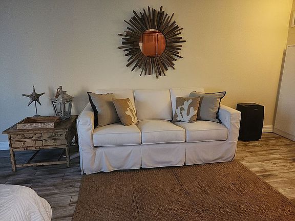 Directly on the Beach Large Gulfside Pool w/ BBQ/Picnic and game area Game Room, Kiddie Pool Hoa provided WIFI Onsite seasonal snack bar Shared balconies, no private balcony 7th floor studio rental ready, excellent reviews New air conditioner New slipcovered sleeper sofa King bed Smart tv